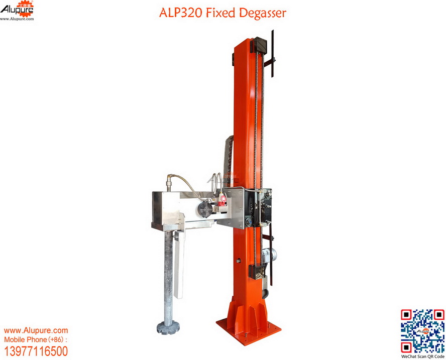 ALP320 is a mechanical-electrical separated fixed type square column degasser equipped with dual-chain lift. Square column as support features a firmer structure, and dual-chain lift, smoother up & down. System is designed especially for extra high furnaces or furnaces placed on platforms. Electric control and degasser are separated for better control. Degassing medium: 99.996% pure nitrogen or argon, provided by gas center and gas cylinders can be set aside the degasser.