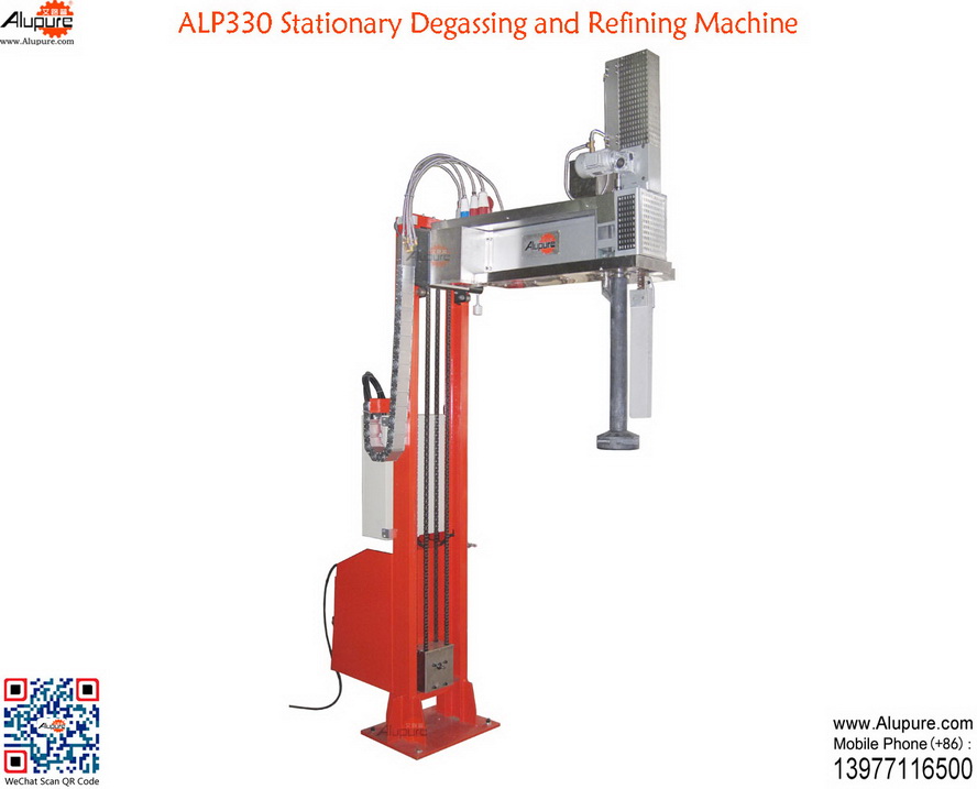 ALP330 is an integrated multi-functional fixed degasser for AL melt degassing and refining. This system integrates functions such as auto refining flux feeding, auto suction and auto up & down baffles and rotor degassing together to achieve the best result by auto-switching degassing and refining. ALP330 greatly reduces labor work, raises refining flux use efficiency ratio and saves flux. It also decreases degassing and refining time, saves inert gas, cuts down consumable part loss, improves recovery rate of AL waste and saves energy. It can achieve AL refining, degassing, and waste removal at the lowest cost and at the shortest time, improving ALmelt quality and lowering cost. It brings significant economic benefit in a long run.