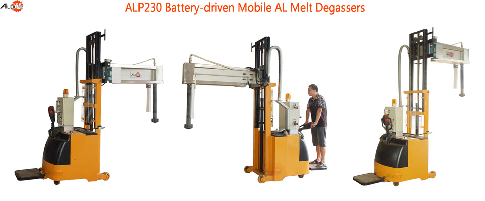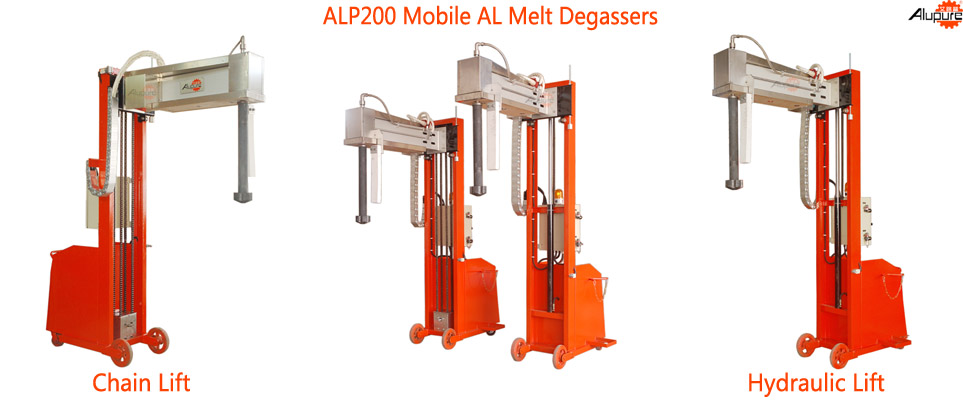 ALP400 is an online degasser, equipped with electric lift and swing degassing arm. System can be installed at furnace edge, specially customized for continuous melting and holding furnaces. This system can be installed at the edge of integrated holding and melting furnaces to provide continuous homogenized mixing and degassing, effectively solving the problems of this sort of furnaces caused by lacking efficient degassing room and methods or low degassing efficiency of ceramic degassing pipes.